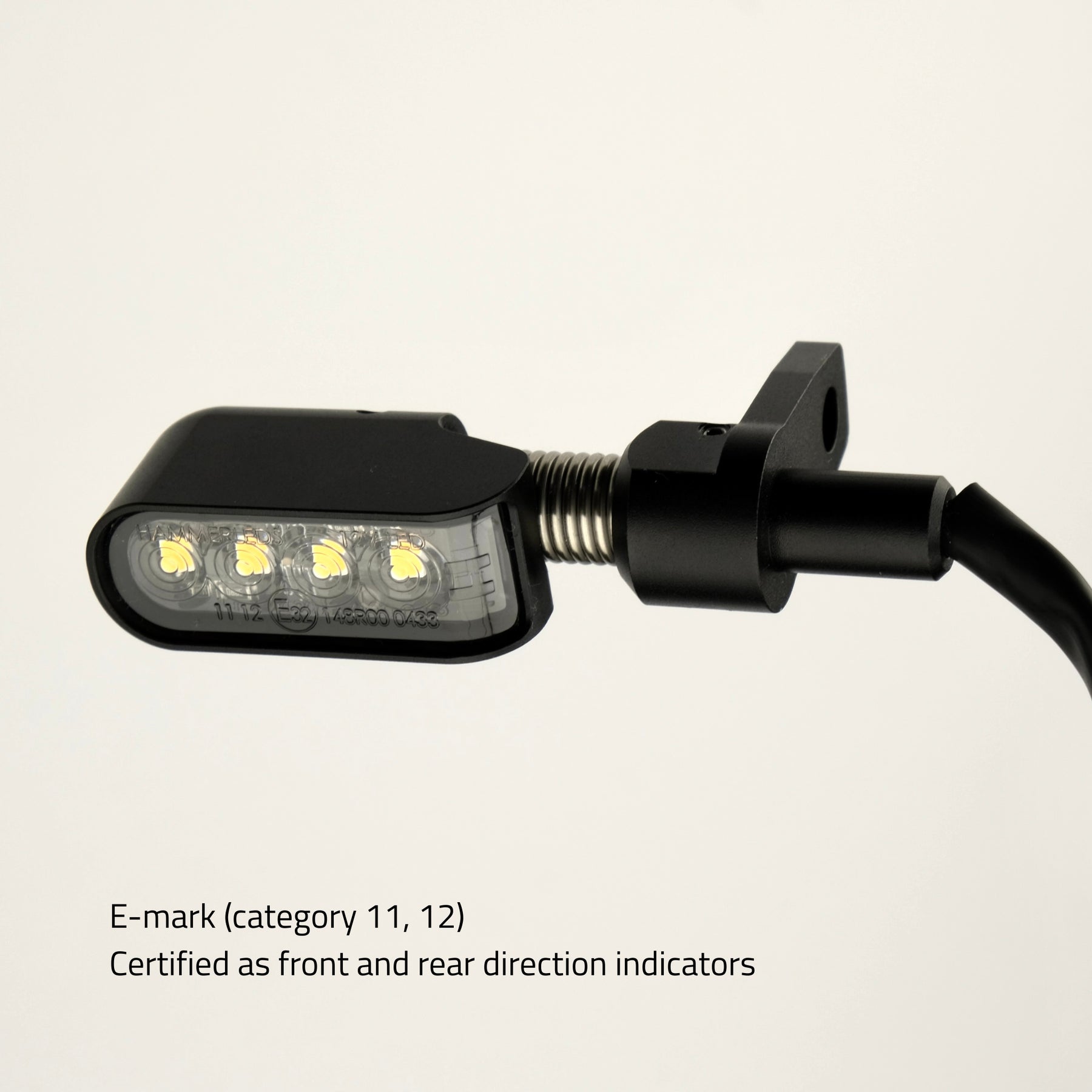 ✔ Extra durable materials ensure these turn signals will last a long time. Flex 4 turn signals are built to last. No plastic parts and compromises in build quality. Enclosure is CNC'ed from tough 6-series aluminium, hard anodized for scratch resistant and UV protected surface. The spring is made from stainless steel to avoid corrosion. Thick, 2mm polycarbonate lens with reinforced carcass.
